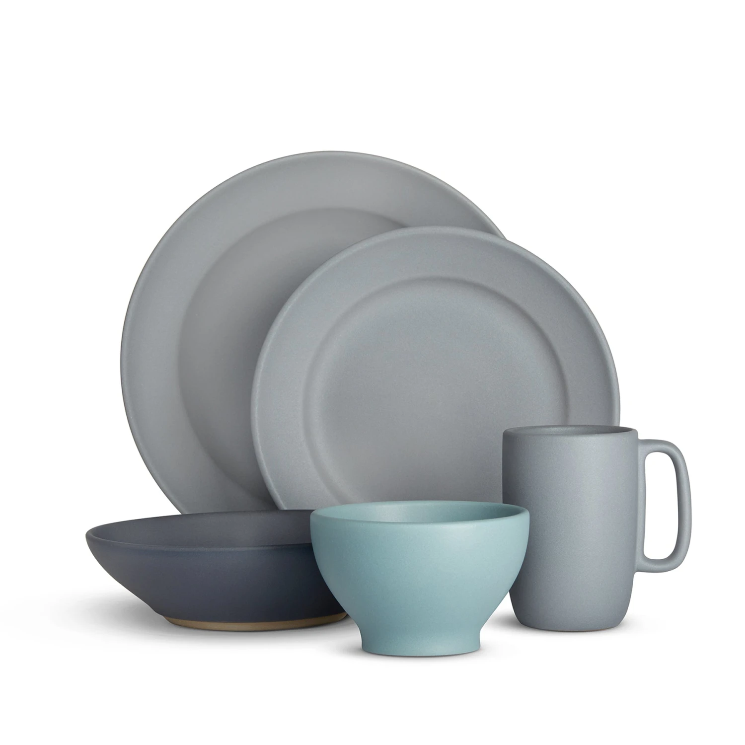 A grand assortment of cool, rich greys—the main dinner plate and salad bowl in the saturated color Slate, balanced with rich Indigo. The full set includes the cafe bowl in Bluejay, a bright matte accent. A portion of the proceeds are donated to the Edible Schoolyard Project, whose mission is to provide a free, sustainable school lunch for students K–12 in public schools throughout the country.